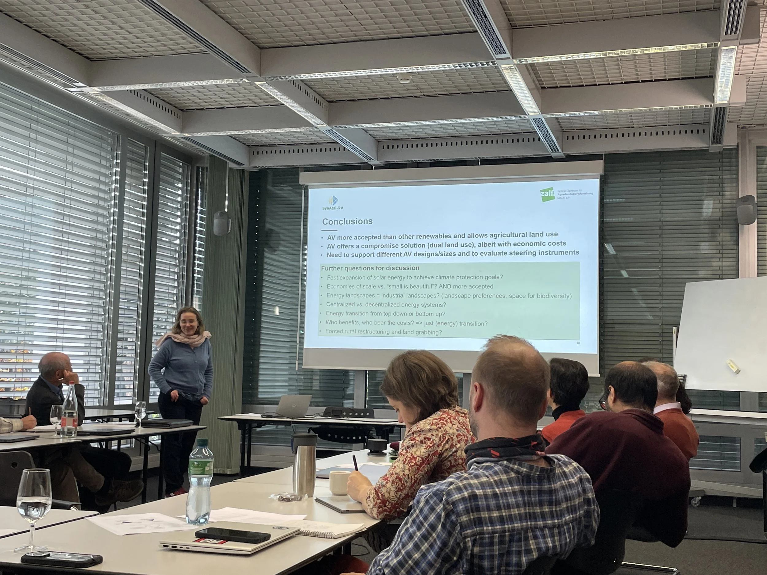 Alexandra Doernberg (Leibniz Centre for Agricultural Landscape Research) presented agrivoltaics, explaining how integrating solar panels with farming can benefit both renewable energy targets and agriculture. She discussed varying stakeholder perceptions—farmers, conservationists, and policymakers—regarding the risks and benefits, as well as issues around site selection and scale. Both presentations highlighted the importance of community involvement, clear information, and integrating place-based approaches to improve acceptance and increase the chances of successful implementation of these innovative practices.