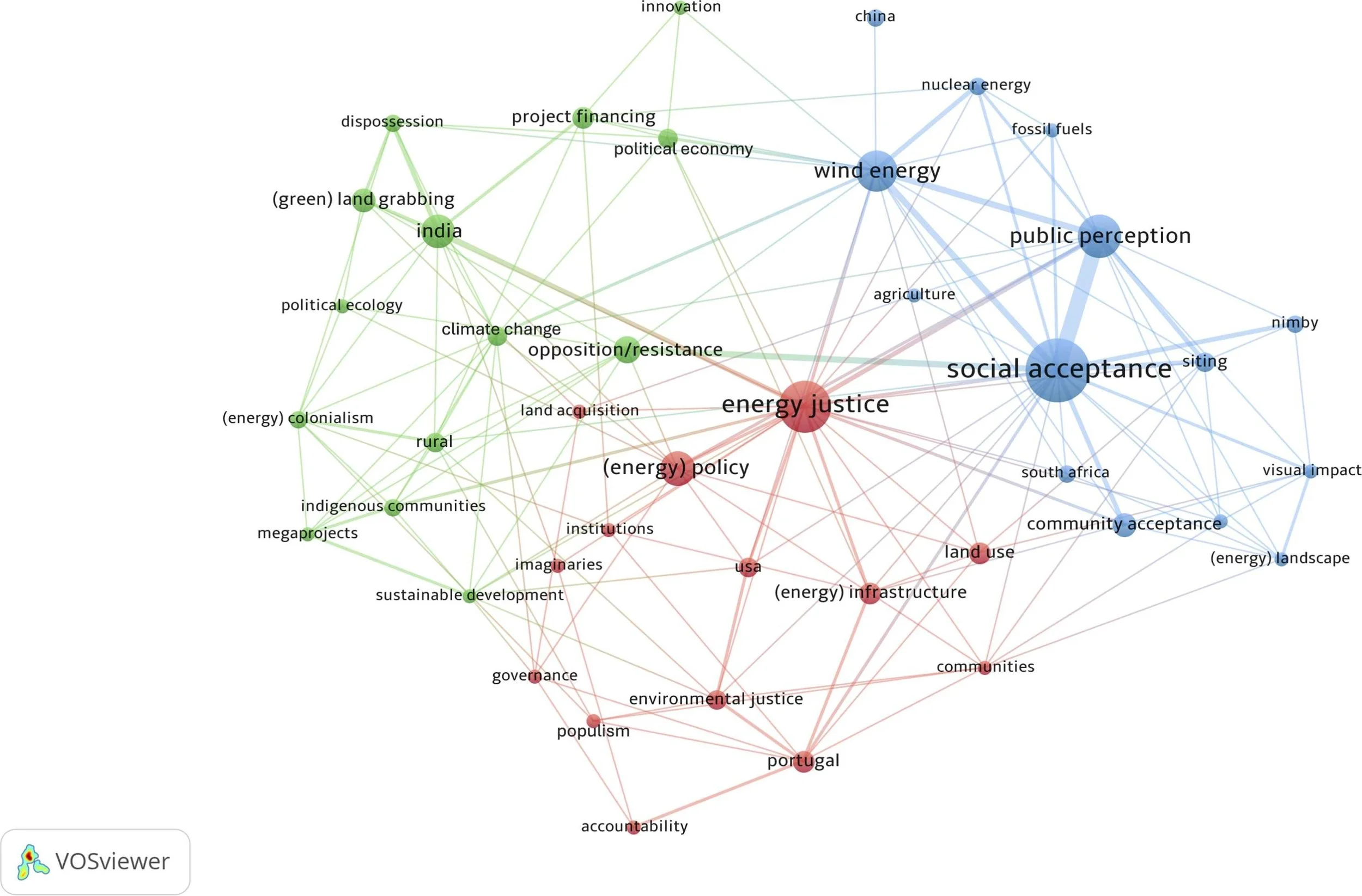 The network analysis of article keywords suggested three clusters of research objects, concepts, geographical contexts and subjects that broadly align with the research programs of social acceptance, energy justice and political ecology.